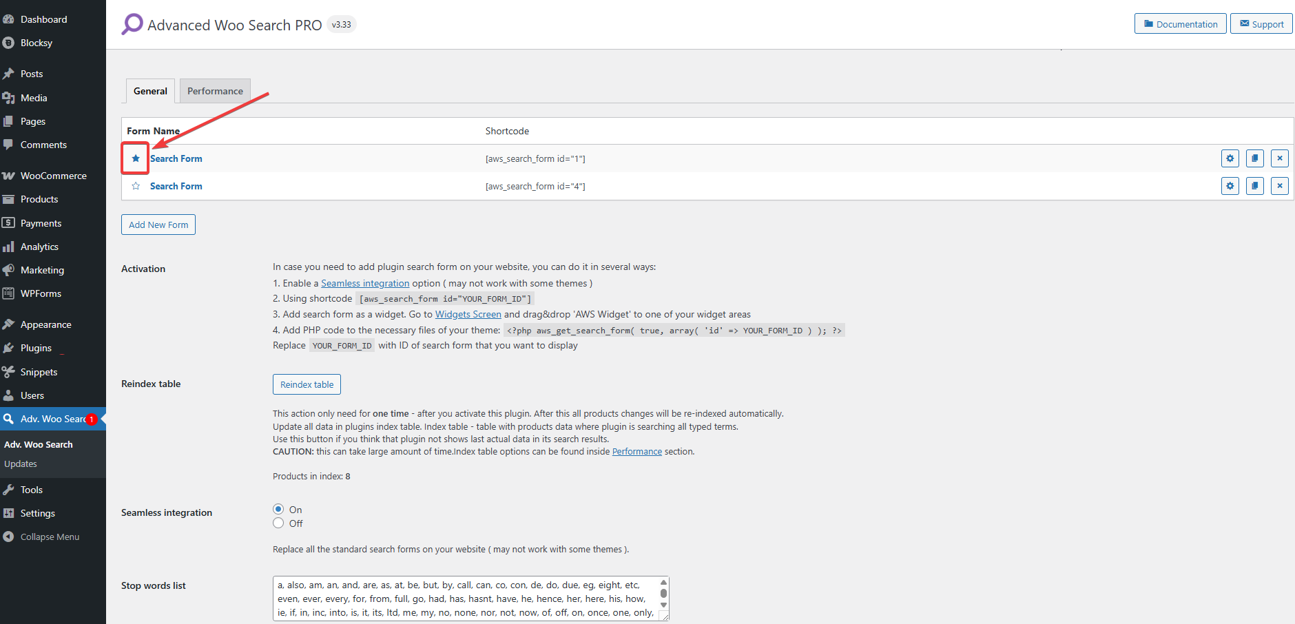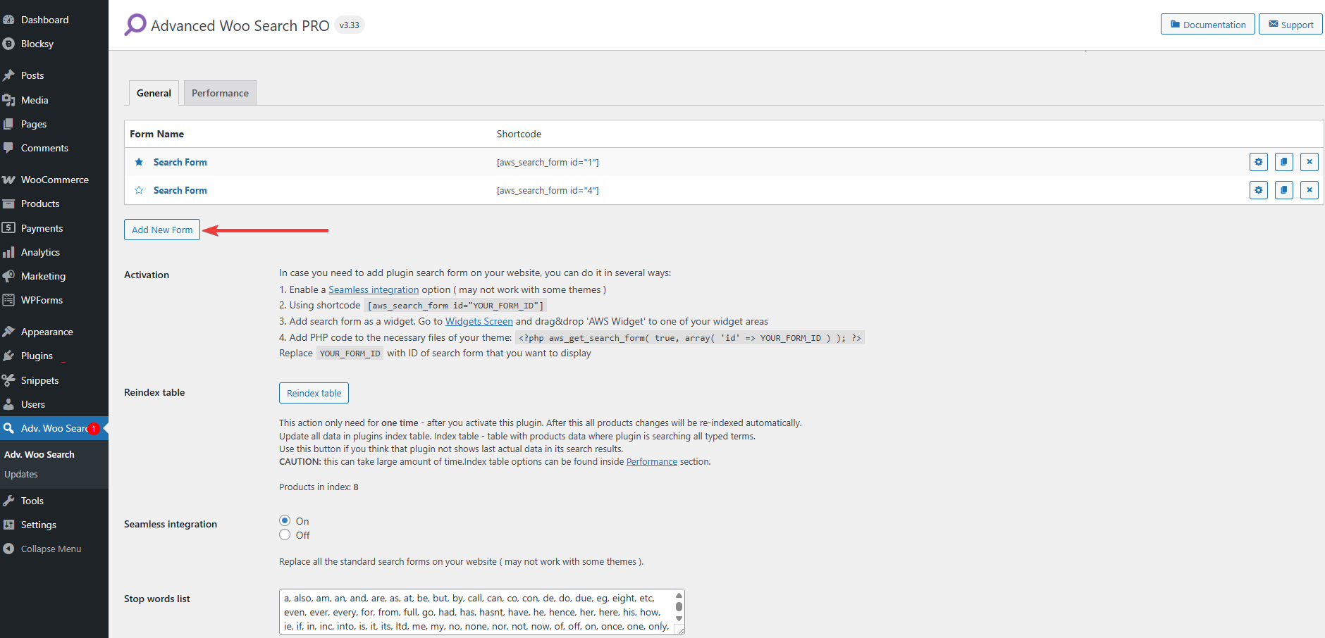 If you're using the Pro version, you can create and manage multiple search forms with different configurations. To create a new form, go to Adv. Woo Search → Add New Form. Each form will appear in your dashboard, allowing you to assign different filters or settings based on where you plan to use them.
