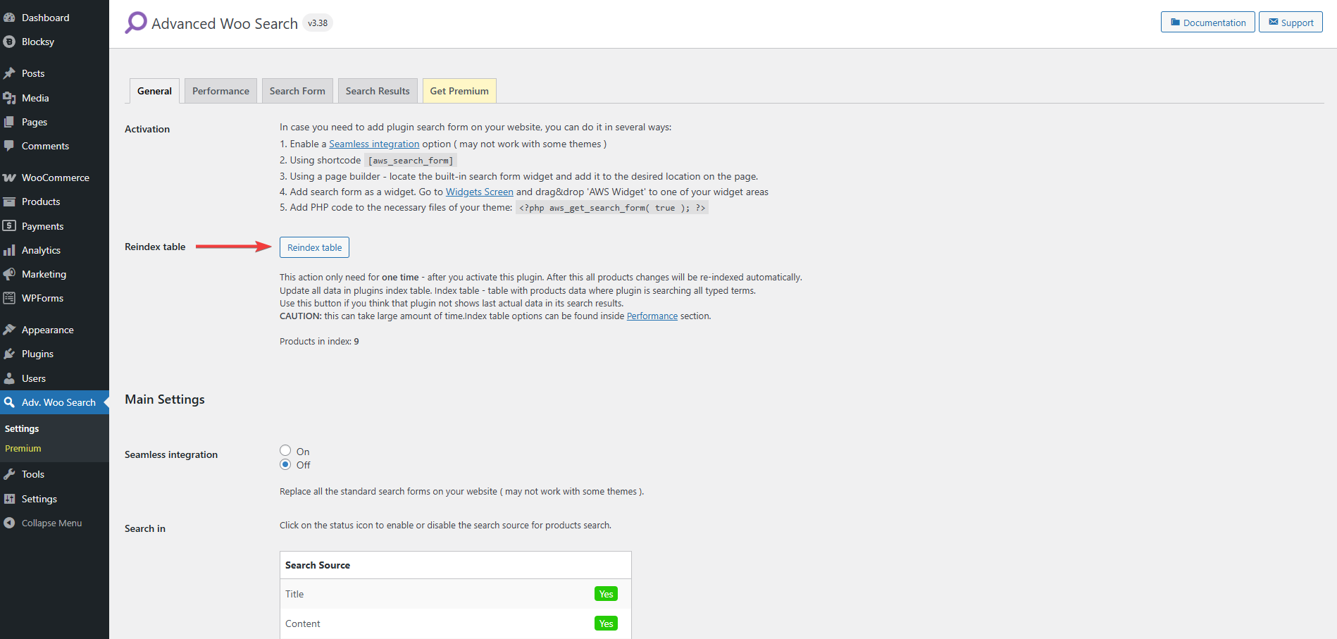 Next, navigate to Adv. Woo Search → General and click the Reindex table button. This indexing process builds a custom database that powers the plugin’s smart search. It ensures your entire product catalog is searchable in real time with accurate, fast results.