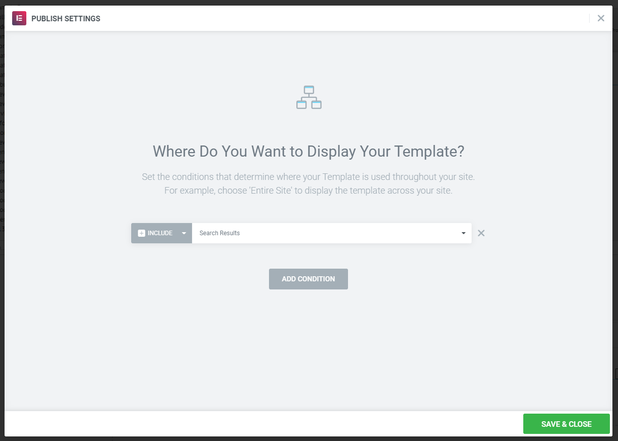 6. When you're finished, click Publish. In the Publish Settings pop-up, set the rule to Include: Search results to apply this template only to the WooCommerce search results layout.