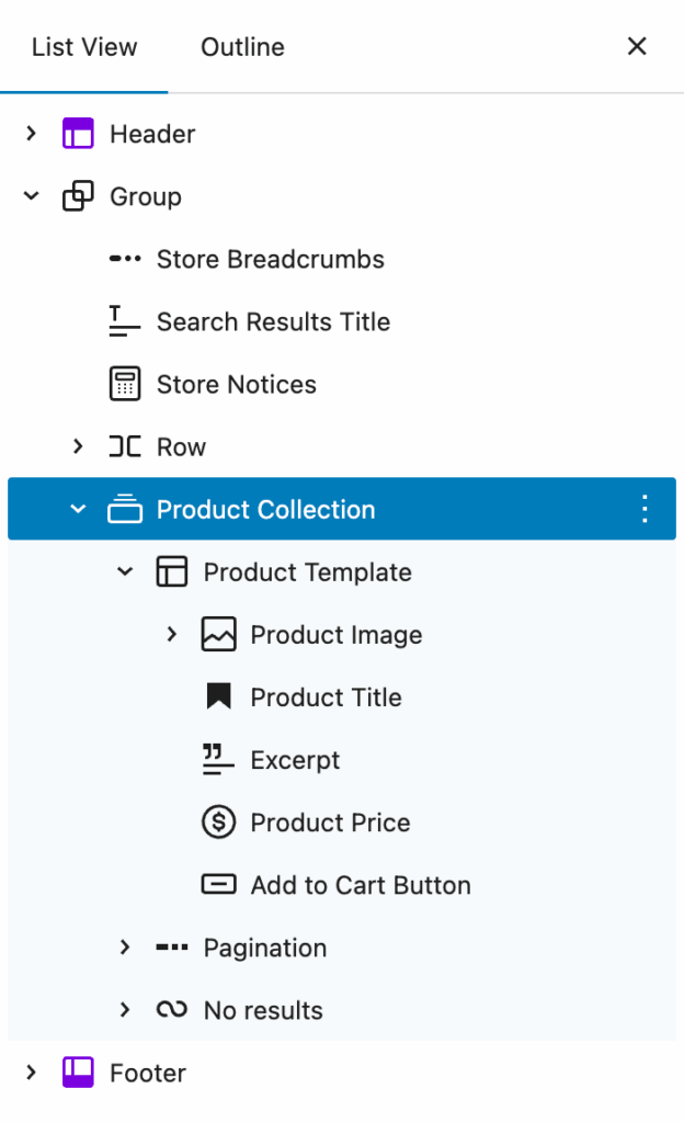 2. You are now inside the page editor for the WooCommerce search results page. The main block for this page is the Product Collection, which contains the template for each product in the results loop, as well as elements like pagination and the 'no results' text.