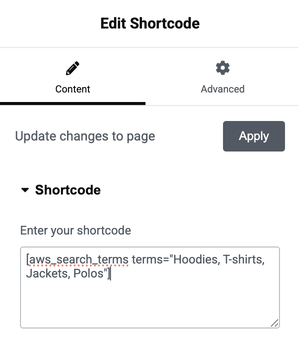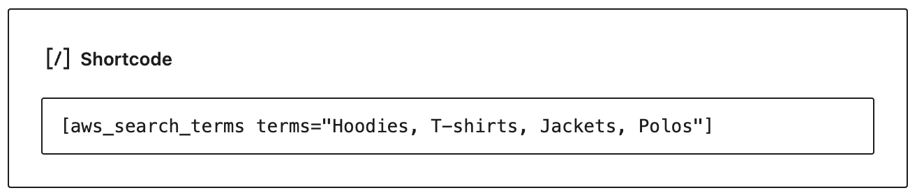 echo do_shortcode(['[aws_search_terms terms="Hoodies, T-shirts, Jackets, Polos"]']);