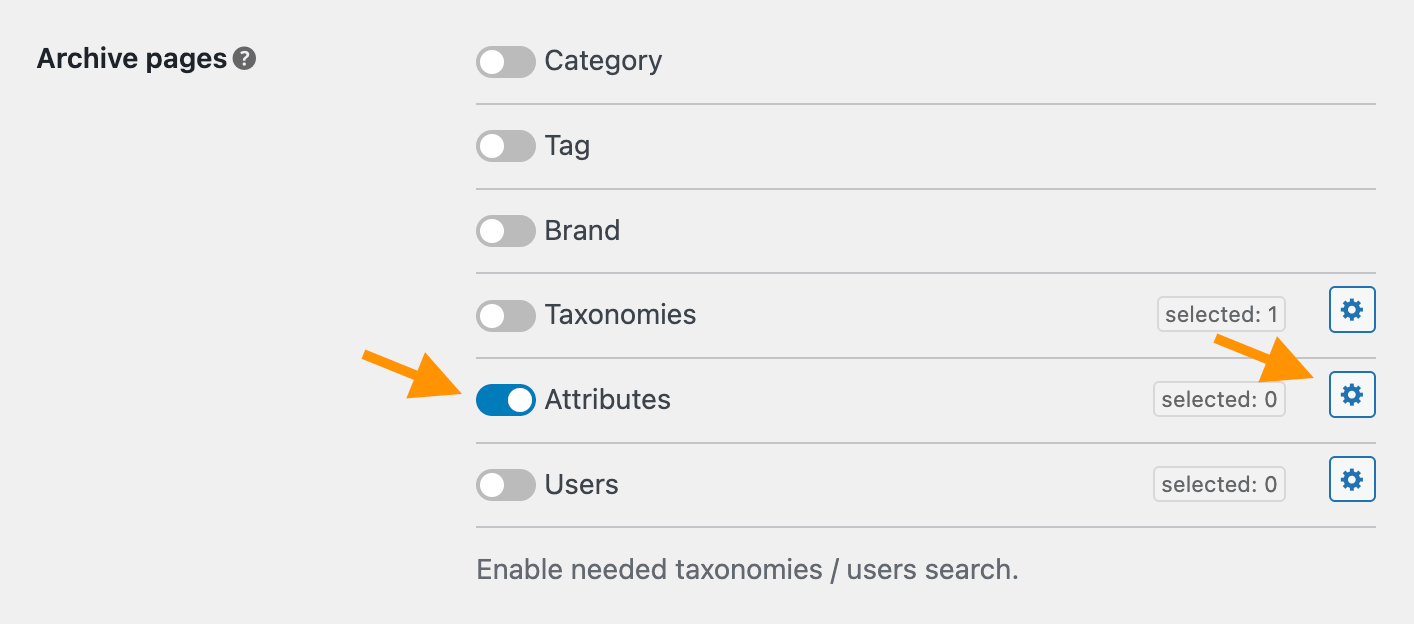 Then click on gear icon near the Attributes option. Here you need to choose what product attributes must be available for searching. By default all of them are disabled.