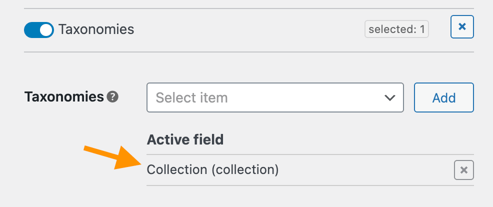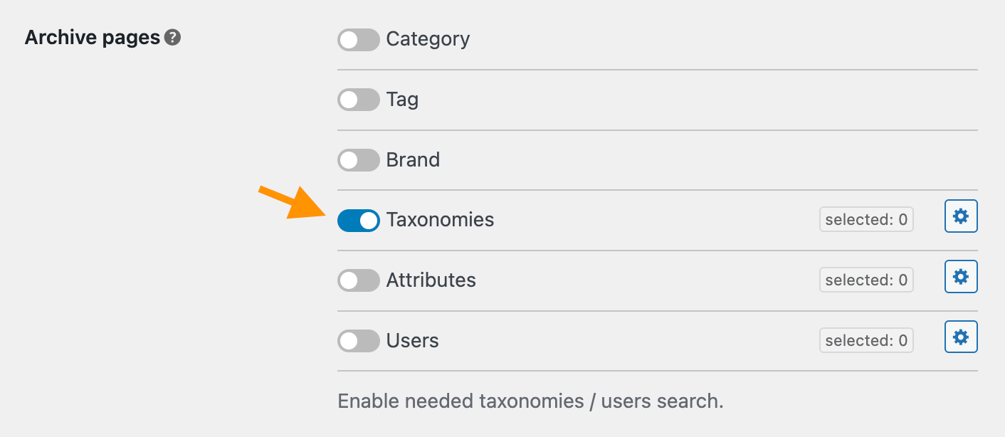 Next click on the gear icon near the Taxonomies option. You need to choose what product taxonomies must be enabled for searching. By default all of them are disabled.