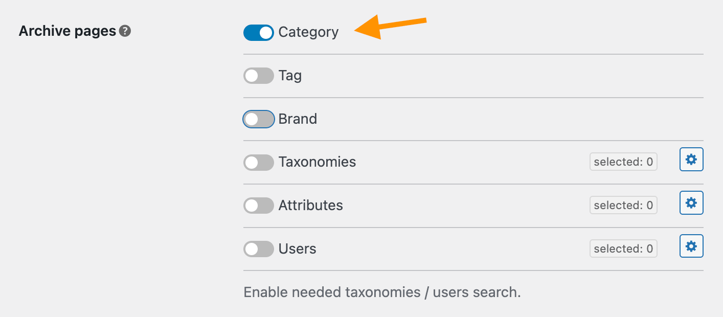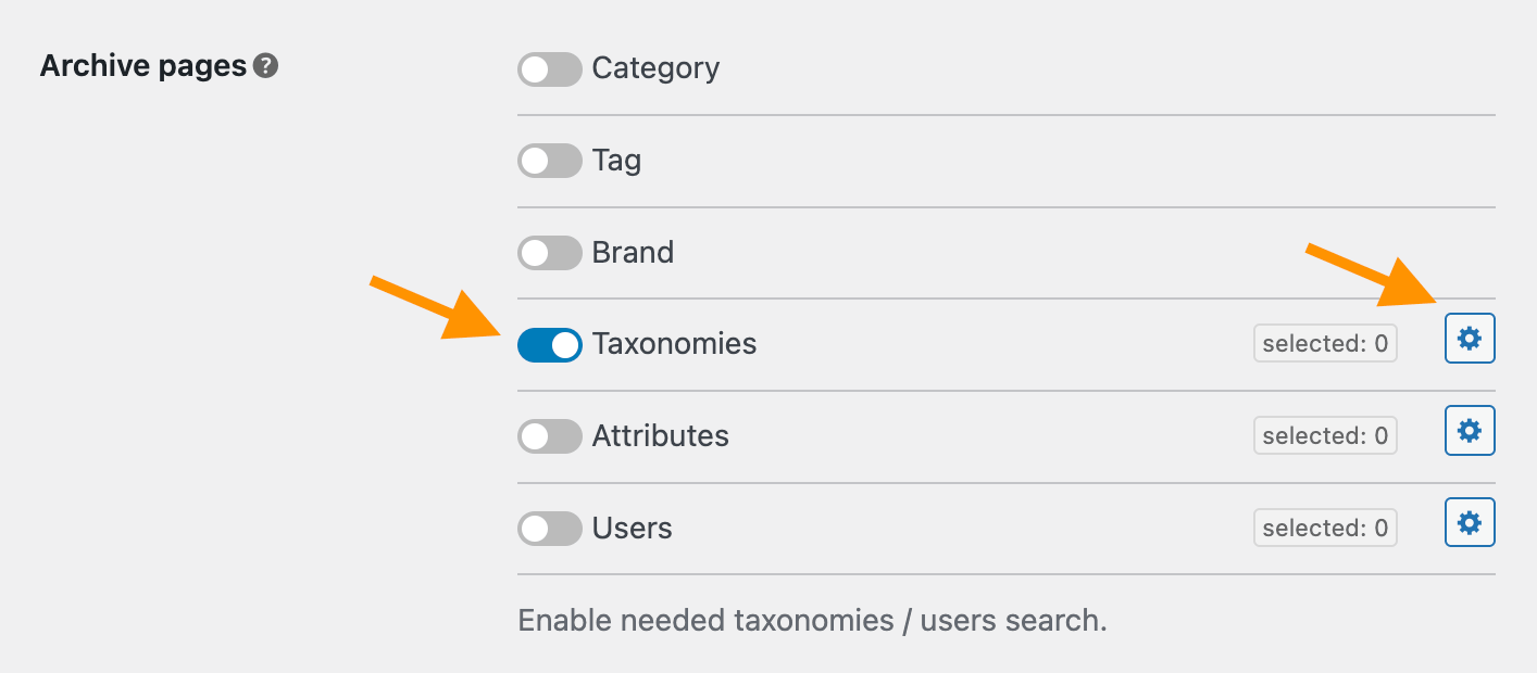 Then we need to choose what taxonomies from the list of available ones must be enabled for searching. By default all of them are turned off.